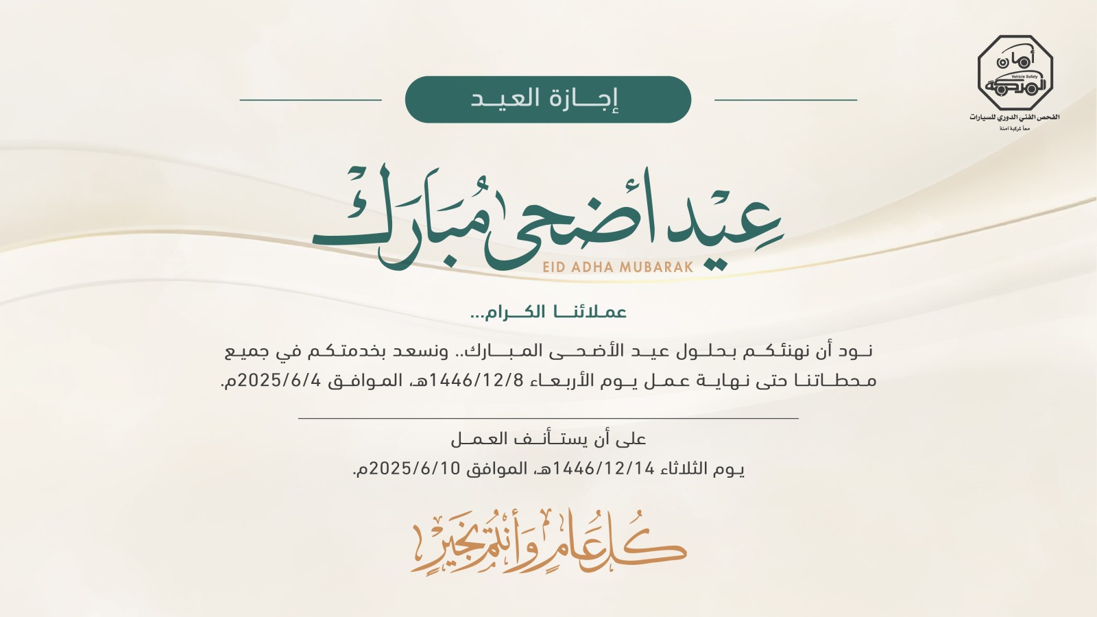 عملائنا الكرام ... نود أن نهنئكم بحلول عيد الأضحى المبارك .. ونسعد بخدمتكم في جميع محطاتنا حتى نهاية عمل يوم الأربعاء 8/12/1446هـ، الموافق 4/6/2025م.